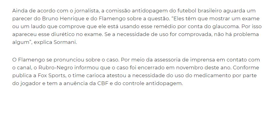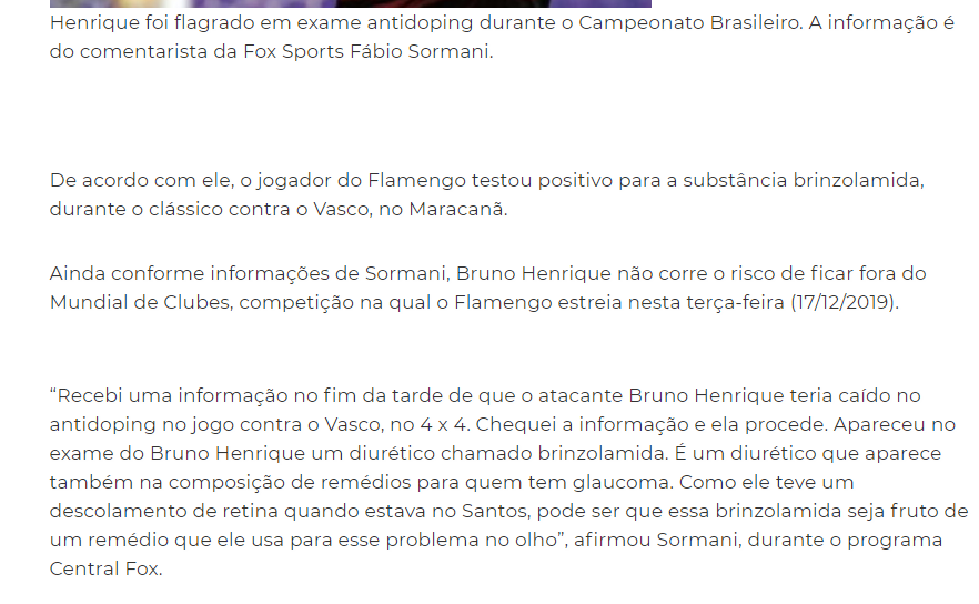 ?نادي فلامنجو كان قد نشر بيانًا لتوضيح الأمر: "برونو هنريك سبق له التصريح من قبل الاتحاد باستخدام برنزولاميد لعلاج الجلوكوما، تم إغلاق هذا الموضوع نوفمبر الماضي".