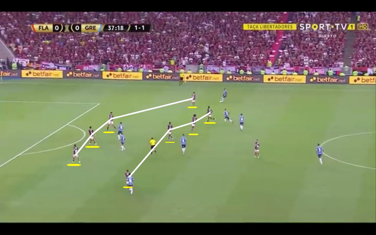 ?خورخي طور فريقه تكتيكيًا بأسلوب الـ4-4-2 تتحول إلى 4-2-3-1 او 4-3-3 هذه التشكيلة فيها اكثر من لاعب سبق لهم اللعب في اوروبا “لويس-رافينيا-الفيش" وهدافهم غابيغول المعار من الإنتر بسبب ضعفه التكتيكي وأهم لاعب في تشكيلة فلامنغو هو رقم 14 جيرسون ويعتبر القلب النابض للفريق