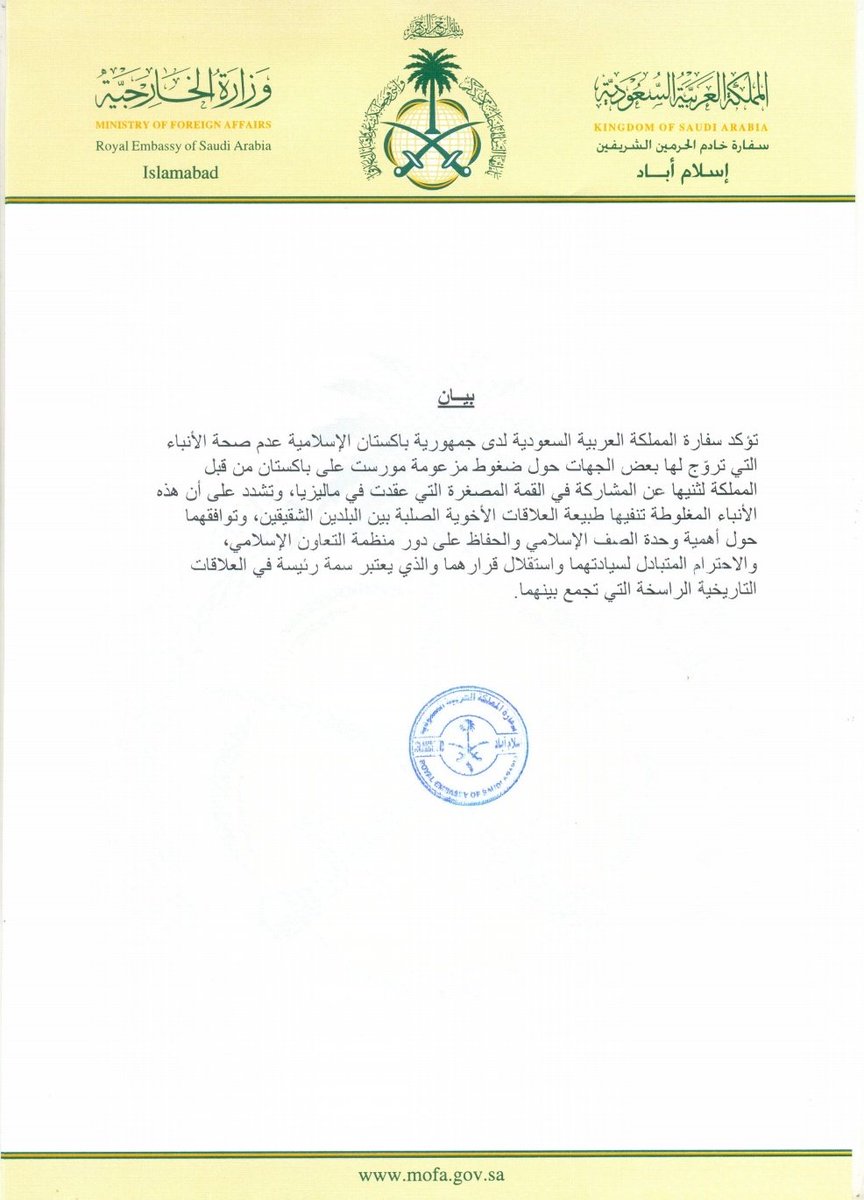 ردود أفعال تصريحات السيد رجب طيب أردوغان في #باكستان كانت ما بين مكذب ومصدق، بعض الذين نشروا تصريحات السيد أردوغان، نشروا أيضا الرد الذي نشرته السفارة السعودية على حسابها في تويتر ولكن دون أن تشير إلى أردوغان أو الإعلام التركي، ولعل هذا بسبب المهنية الدبلوماسية الإعلامية.