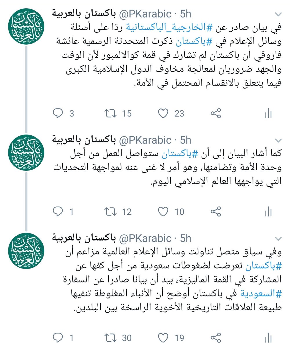 الموقف الباكستاني الرسمي الصادر عن وزارة الخارجية الباكستانية هو أن #باكستان لم تشارك في قمة كوالالمبور لأن الوقت والجهد ضروريان لمعالجة مخاوف الدول الإسلامية فيما يتعلق بالانقسام المحتمل في الأمة، وأن باكستان ستواصل العمل من وحدة الأمة وتضامنها ومواجهة تحديات العالم الإسلامي.