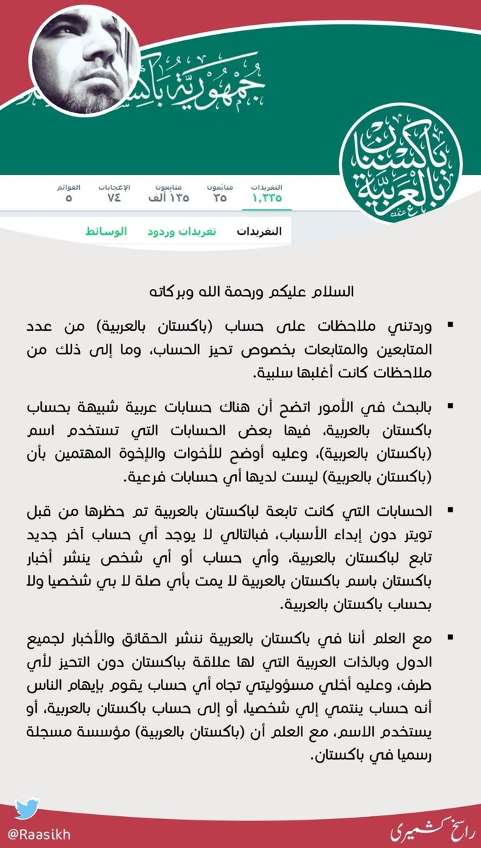 ملاحظة أود أن أشير إليها وهي أن هناك بعض الحسابات توهم القراء العرب أنها تابعة لباكستان بالعربية @PKarabic وتنشر معلومات مشوشة مغلوطة غير مؤكدة، فيظنها الناس أنها تابعة لحسابي الشخصي أو حساب باكستان بالعربية، عليه فقد نشرت صباح هذا اليوم المواقف الرسمية والمؤكدة، يرجى التنبه.