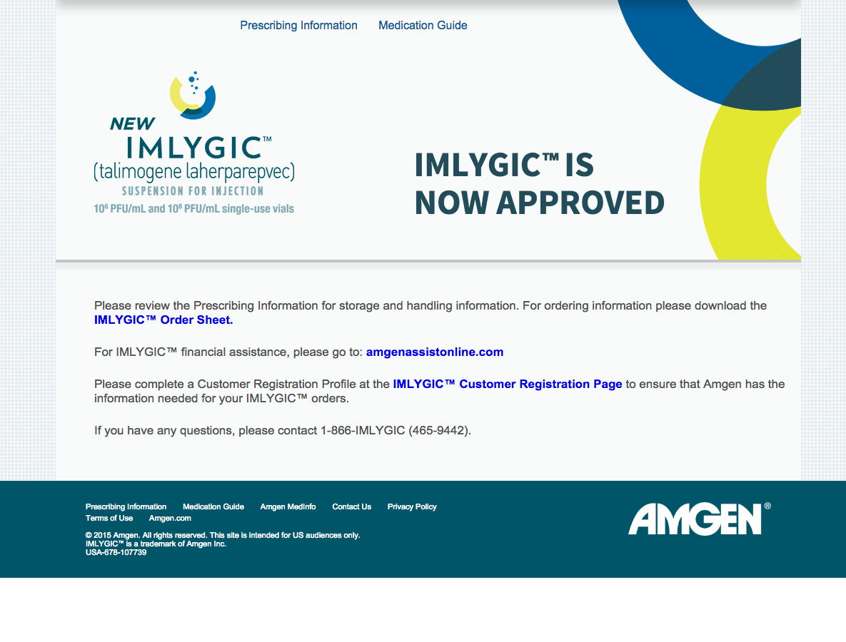 تمت الموافقة على هذا #العلاج_الجيني في امريكا واوروبا في ٢٠١٥ لعلاج سرطان الجلد كثاني علاج فيروسي قاتل للاورام (oncolytic virus)، وهو فيروس هربس بسيط (HSV1) معدّل وراثياً للتكاثر داخل الأورام وإنتاج بروتين (GM-CSF) لتنشيط المناعة .