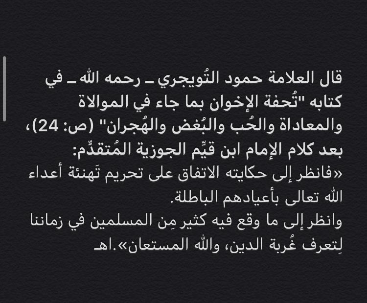 قال العلامة حمود التُويجري ــ رحمه الله ــ في كتابه "تُحفة الإخوان بما جاء في الموالاة والمعاداة والحُب والبُغض والهُجران" (ص: 24)، بعد كلام الإمام ابن قيِّم الجوزية المُتقدِّم:...