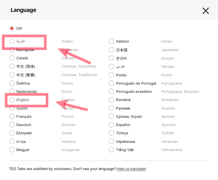 الطريقه فعاله جدا ويمكن من خلاله مشاهده فيدوهات TED بلغتين او اكثر بنفس الوقت ايضا تنفع للمسلسلات والافلام