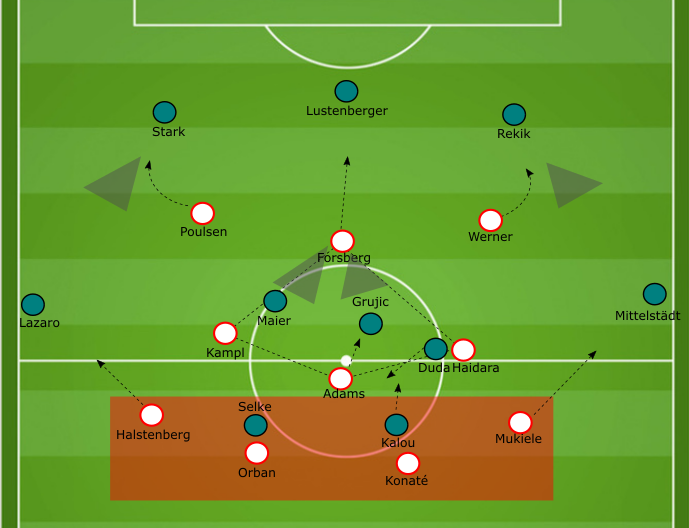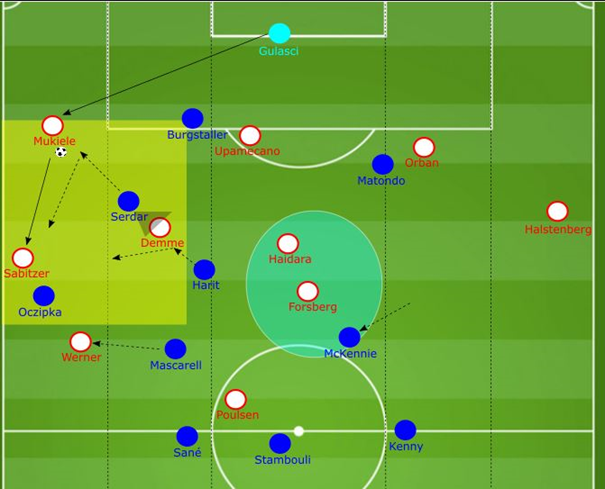 @abdelhamid_25 بدلاً من ذلك، يمكن للاعب الإرتكاز أن يضغط بقوة على الجناح كما نرى في مشهد شالكه ضد لايبزيغ في الصورة.
