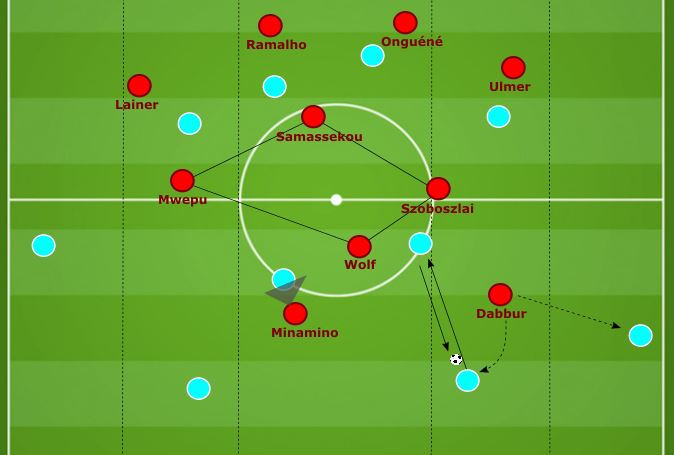 في باديء الأمر, بإمكاننا إلقاء نظرة على الضغط الذي يقوم به وولفزبرغر. مهاجمو وولفزبيرغر يضغطون على قلوب الدفاع عن طريق الركض بشكل مقوس إنطلاقا من الأطراف و بالتالي يجبرون الخصم مباشرة على التحول لمنتصف الملعب.