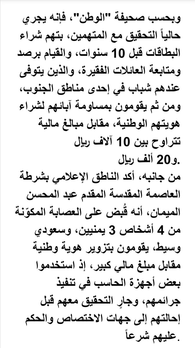 على عصابة بيع بطاقات #الجنسيه_السعوديه للموتى ب(250)الف ريال لتجنيس مقيمين وتتكون العصابة من(3) يمنيين وسعودي