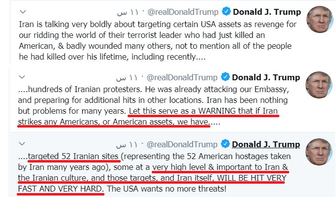لا أرتاب بأن تغريدات ترامب الثلاث صباح اليوم، التي حملت إنذارا صارما باستهداف أهم 52 هدفا في إيران،