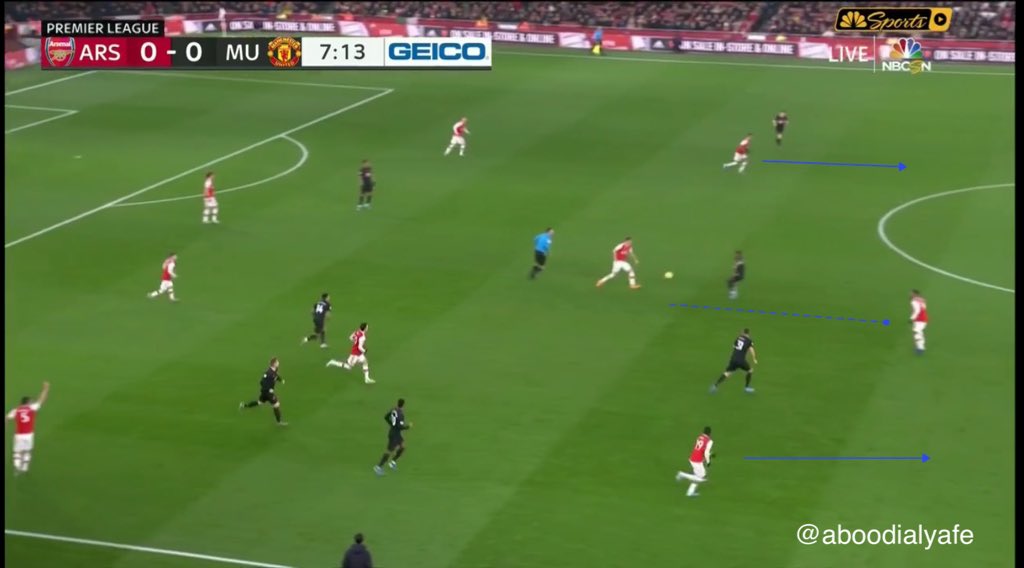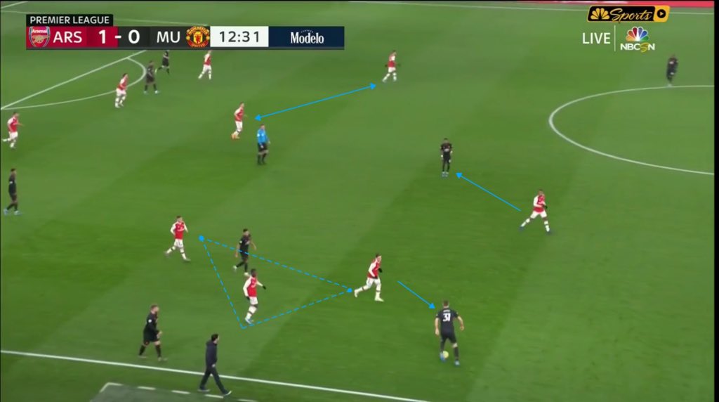 تمركز لاعبيّ أرسنال دفاعيًا دون كرة ممتاز، شاهد المثلثات والتفوق العددي في كل منطقة من أجزء الملعب مما صعب مهمة اليونايتد هجوميًا