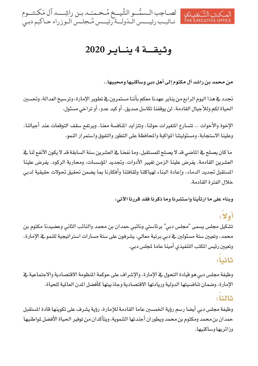 إستقبل أهالي وقاطني #دبي وثيقة 4 يناير 2020 وما إحتوتها من بشائر ترسم ملامح عقد ذهبي يتجدد فيه - كما جاء على لسان @HHShkMohd - "أننا مستمرون في تطوير الإمارة وترسيخ العدالة وتحسين الحياة لكم وللأجيال القادمة، لن يوقفنا تكاسل صديق أو كيد عدو أو تراخي مسؤول"، وبها نقاط جميلة.