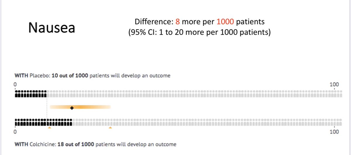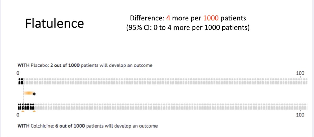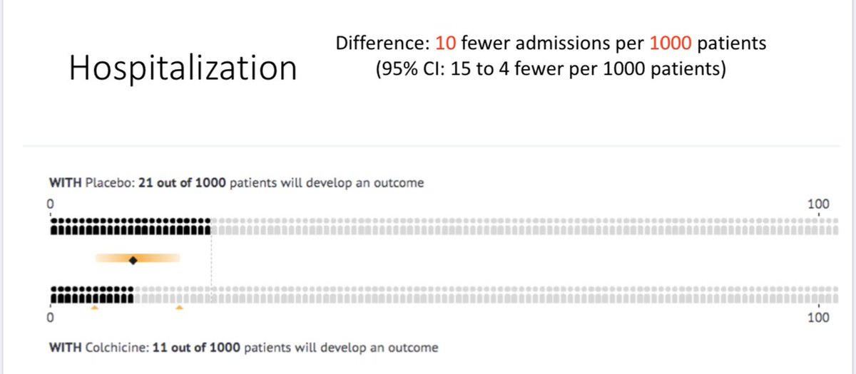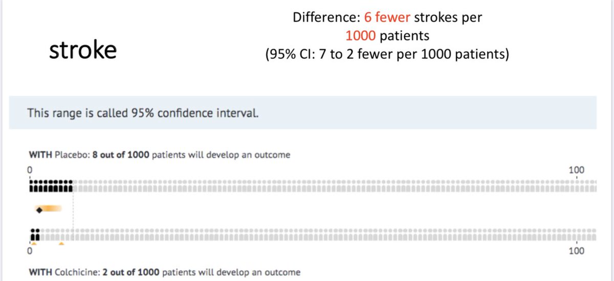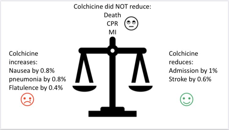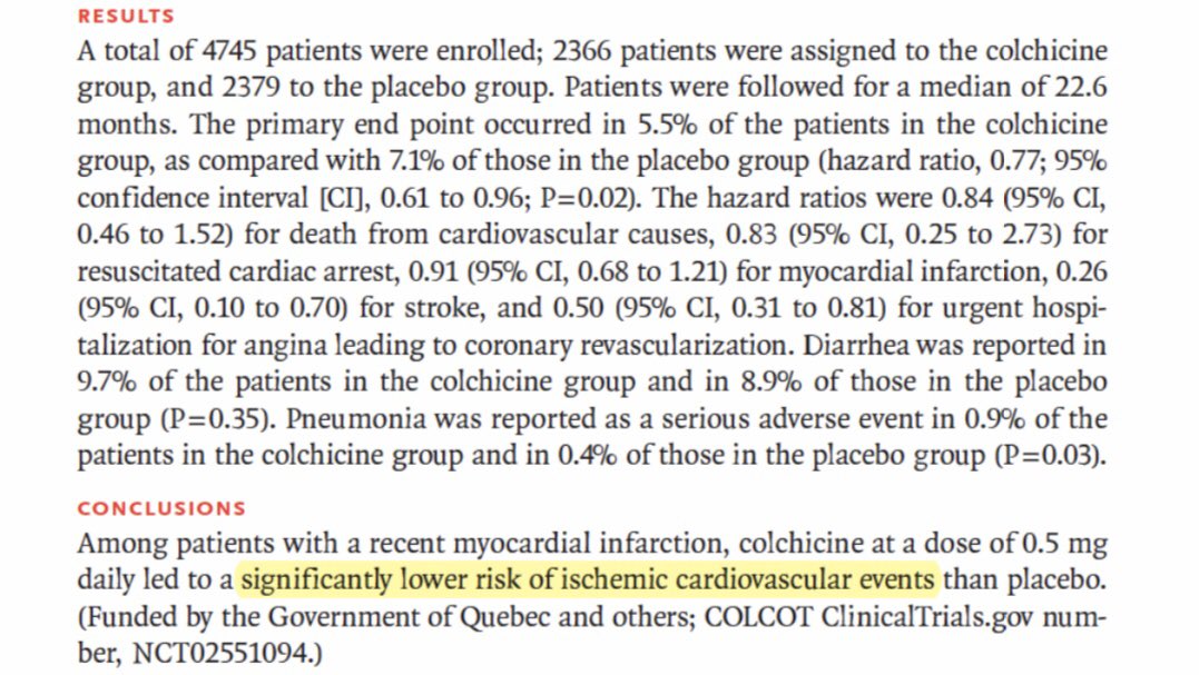 لن اتحدث عن تفاصيل نقد الدراسه هنا، لنفرض انها دراسه عالية الجودة. اذا اكتفينا بقراءة الملخص سوف نقوم باستخدام colchicine لجميع مرضى جلطات القلب في خلال ٣٠ يوم من الإصابة، لان الملخص يقول ان هذا الدواء يقلل من الاصابه بنوبات القلب و الشرايين