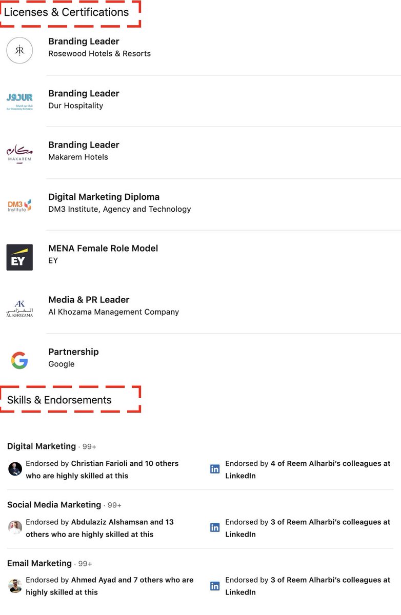 - الشهادات والتراخيص: هنا لا تكتب الدورات اللي أخذتها، مثلاً المحاسبين يضيفون هنا CPA & SOCPA، مدراء المشاريع PMP وغيرها من الأمثلة.