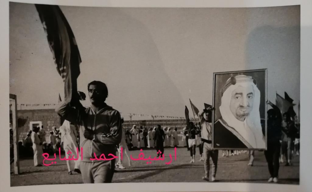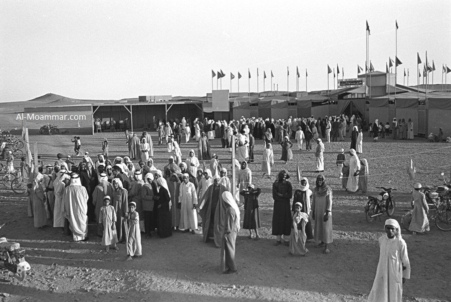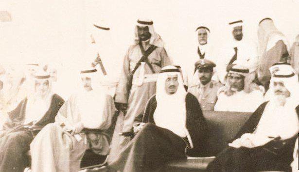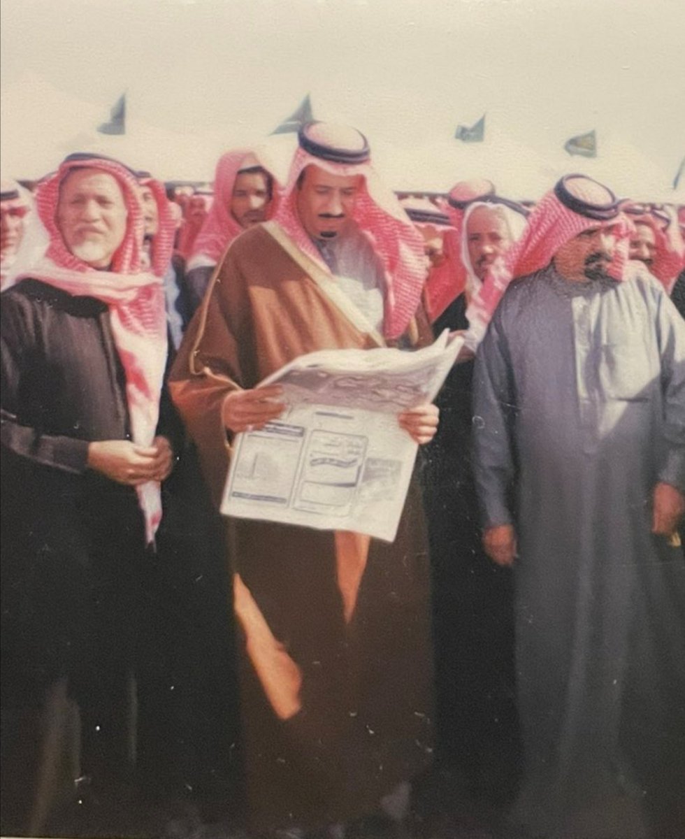 خادم الحرمين الشريفين الملك سلمان بن عبدالعزيز حفظه الله في مقر حفل اهالي #المجمعة (مستشفى المجمعة الان) بأنتظار وصول الملك خالد رحمه الله ويظهر بالصورة بدر العسكر والشيخ عبدالعزيز التويجري رحمهم الله ..