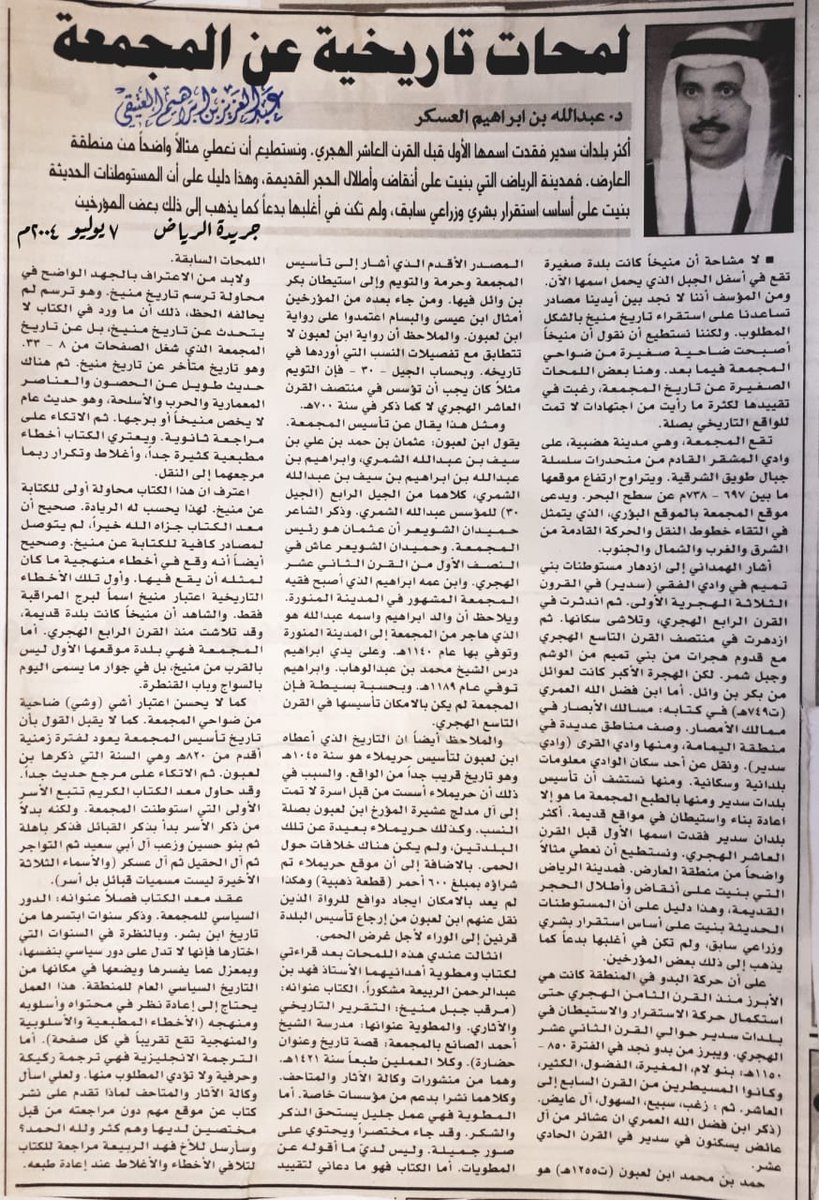 مقال للدكتور/عبدالله بن إبراهيم العسكر ابونايف رحمة الله وأسكنه فسيح جناتة ... بعنوان (لمحات تاريخية عن المجمعة ) نشر في صحيفة الرياض ١٩ جماد الاولى ١٤٢٥هجري