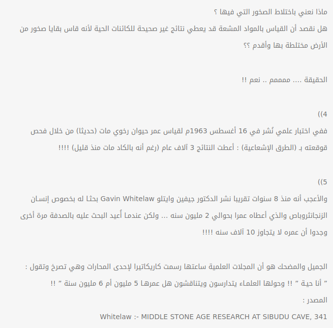 -- 2⃣ ثانيا فضح فشل أسلوب إستخدام مادة الكربون 14المشعة في قياس عمر الحفريات التي تحدد عمر الحفريات القديمة بملايين السنين في حين عمر البشرية لا يتجاوز بضعة آلاف من السنين و فقط.