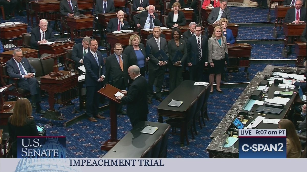 1- يسلم فريق الاتهام الديموقراطيين قضية العزل وبنود الاتهام بمجلس الشيوخ وهو ماحدث اليوم ١٦ يناير.