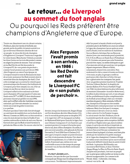 FF | فكلوب قام ببناء آلة حرب حقيقية : مع حارس فاز بالنسخة الأولى من جائزة ياشين (أليسون)، وصيف الكرة الذهبية (فيرجيل فان دايك)، أكثر ظهيرين جهنميين في الوقت الحالي (ألكسندر أرنولد وروبرتسون)، خط وسط الأكثر حدةً، وهجوم من نار على الأرجح هو الأكثر تكاملاً في كرة القدم الحالية.
