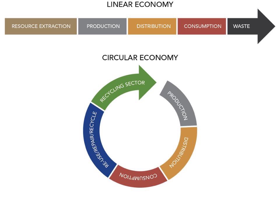 - اقتصاد خطي ( linear economy ) استخراج المواد الخام وصنعها واستهلاكها ورميها