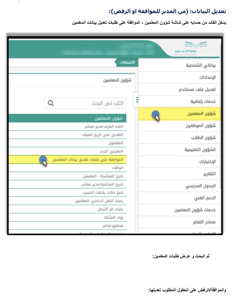 ??من حساب القائد ثم شؤون المعلمين ثم الموافقة على طلبات تعديل البيانات ثم بحث ثم يدخل على الطلب ثم يدققه ثم يضغط موافقة أو رفض ثم يضغط إرسال أسفل الصفحة ثم يتم الاعتماد وينتظر تدقيق شؤون المعلمين??