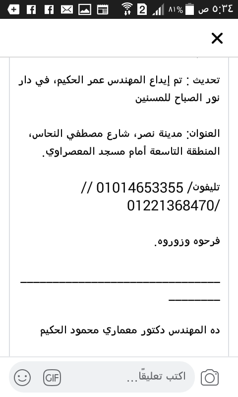 بس للأسف مفيش استجابة ، اتحرك عدد كبير من المهندسين واعلنوا استعدادهم للتبرع وطالبوا النقابة بسرعة التصرف ، محدش عارف ان الدكتور مهندس عمر الحكيم ده واحد من كبار المعماريين وله كتب تعتبر مراجع علمية وبيكتب ويتحدث ب 3 لغات الإنجليزية والفرنسية والألمانية وانه ابن رائد من رواد