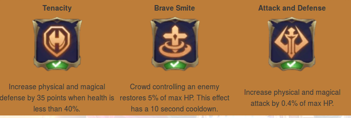 -Brave Smite: يتم إستعادة 5% من الطاقة القصوى في حالة إتمام عملية سيطرة على الحشد كل 10 ثوان.