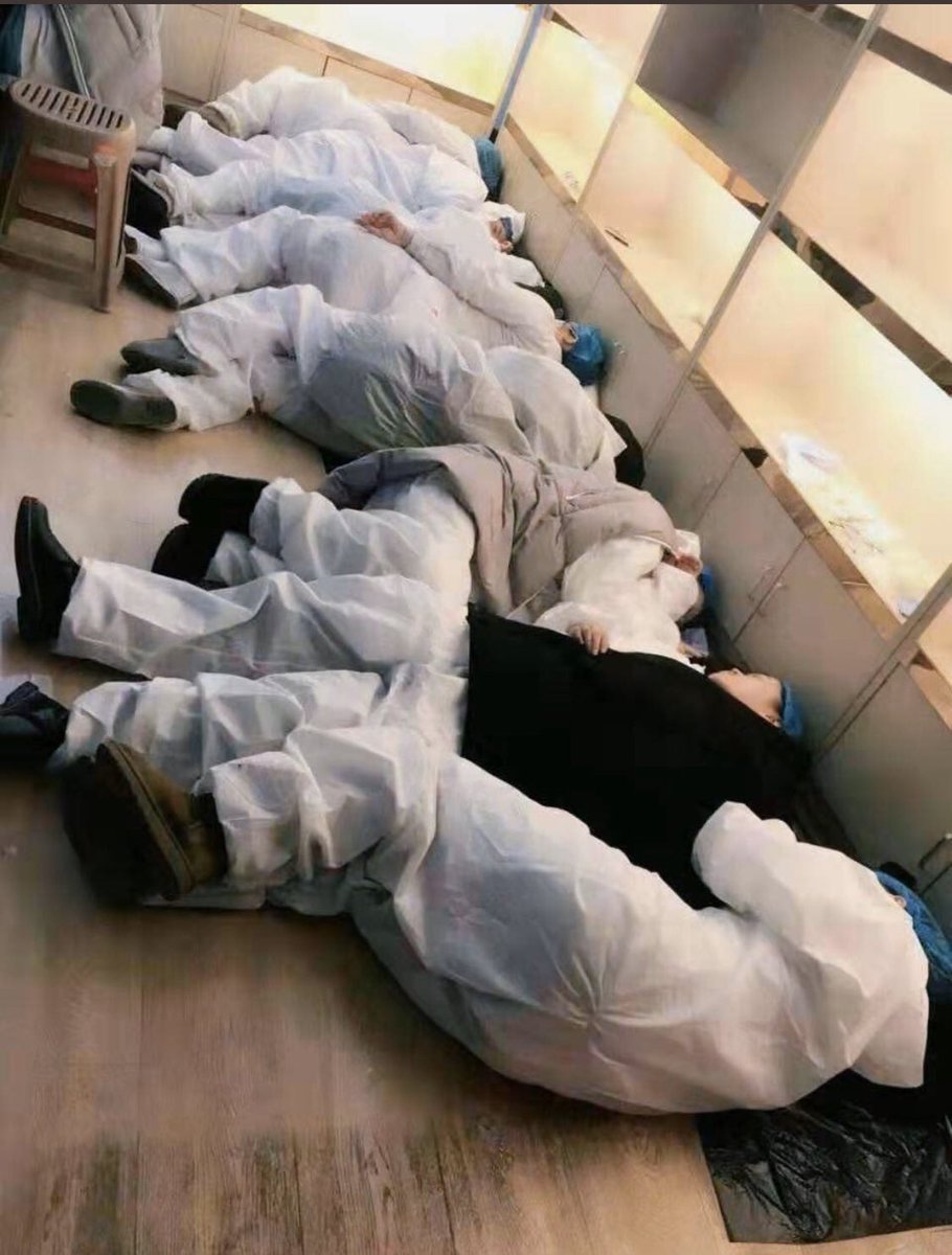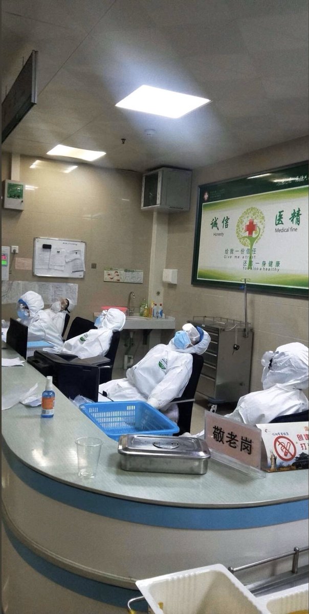 صور من داخل المستشفيات في منطقة الحجر الصحي ضد #فيروس_كورونا الجديد، مدينة ووهان حيث ارهق وتعب من في الخطوط الأمامية ولكن معظمهم يختارون البقاء في المستشفى لسببين وهما ?