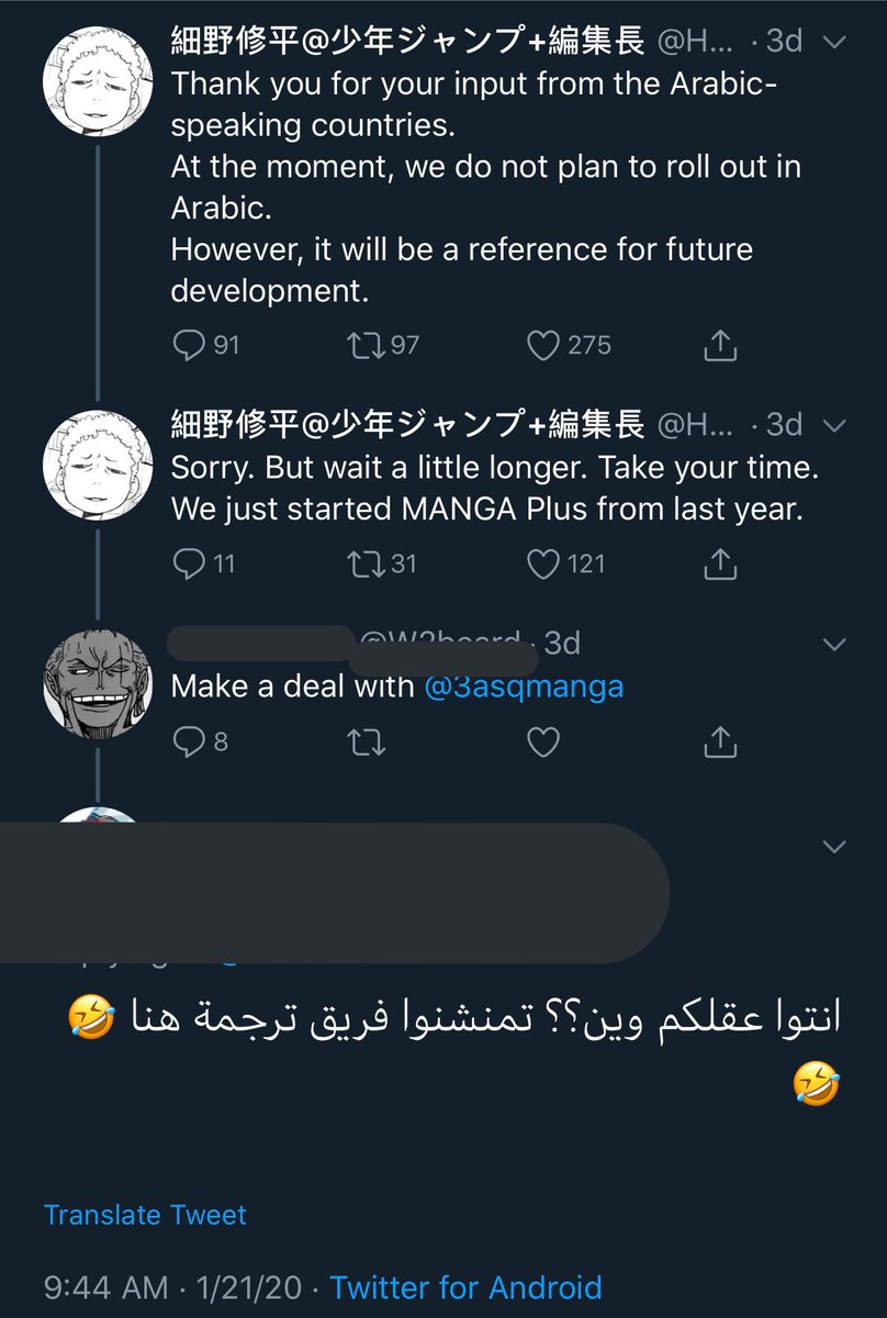 طبعا اتى الرد عنيف من بعض المترجمين واصحاب المدونات -لا علاقه لها بالعاشق- ولكن طالها الاتهام الذي اتى من غالبيه الونبيسيين في الهاشتاق " #onepiece_arabic “ بأنها ترجمة سيئه ومقرصنه = الزبده ضحوا فيهم من اجل هدفهم الاحمق..