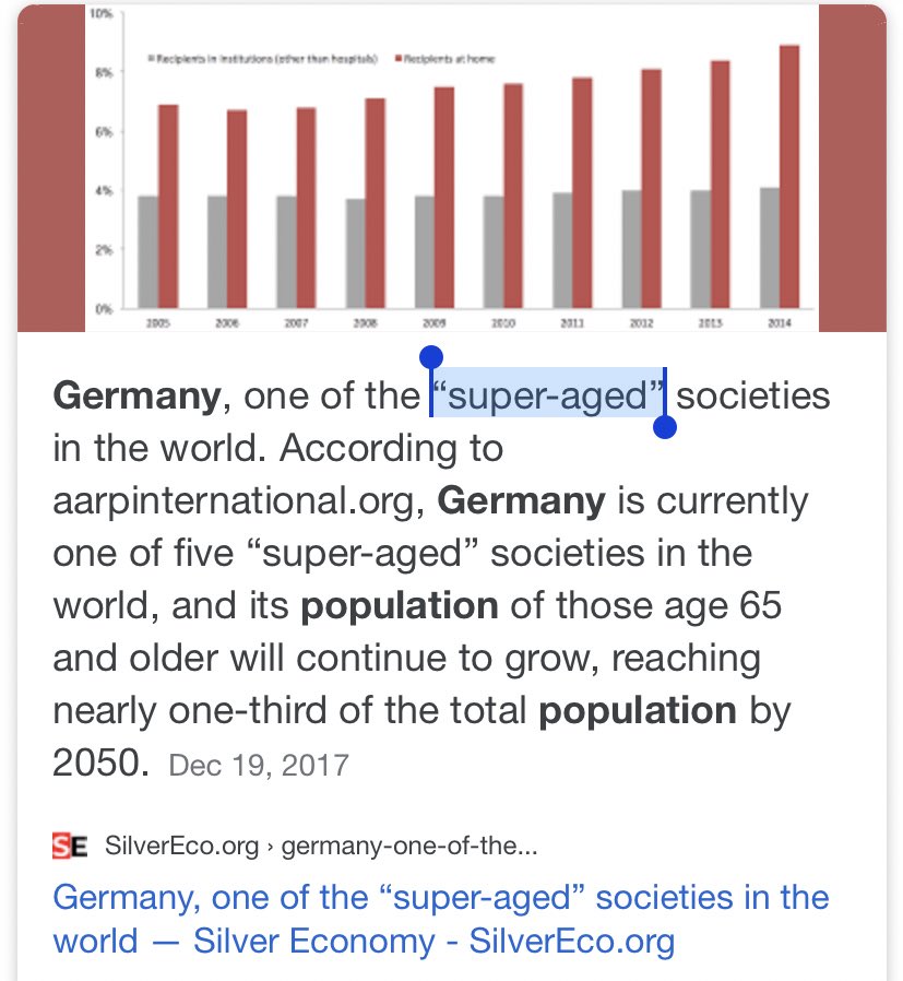 “super-aged” في العالم أي ذات أعداد مسنين فائقة وفقًا لموقع aarpinternational.org تعد ألمانيا حاليًا واحدة من خمس مجتمعاتذات أعداد مسنين عالية في العالم وسيستمر عدد سكانها الذين تبلغ أعمارهم 65 عامًا فما فوق في التزايد.