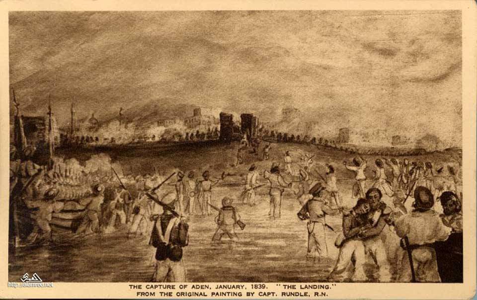 صورة لمعركة سنة 1839 بين ابنا عدن وقوات الاحتلال البريطانية نشاهد فيها سور المدينة وبواباتها الداخلية