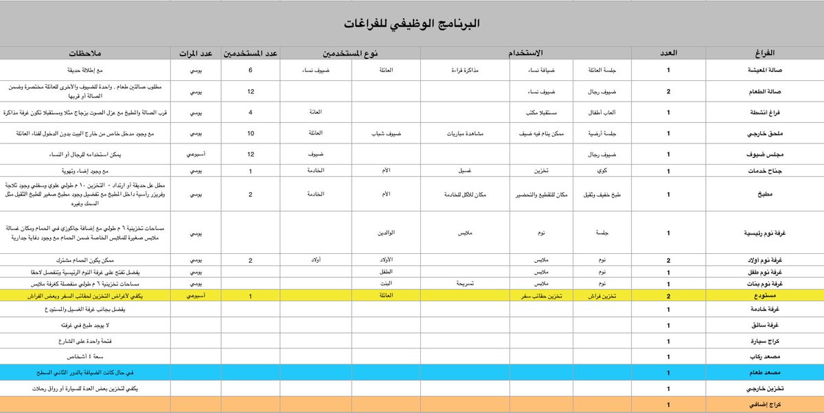 1. حدد احتياجاتك من كل فراغ وبالتفصيل بالإضافة لعمل محددات وأهداف تصميمية للمصمم لمراعاتها مثل الميزانية وغيرها ، وهنا رابط لجدول بصيغة اكسل لتعبئته مع العائلة قبل الذهاب للمصمم bit.ly