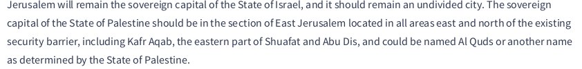 في #صفقة_القرن ستكون القدس عاصمة إسرائيل الموحدة وغير القابلة للتقسيم، وعلى الفلسطينيين أن يختاروا مكانا شرقي القدس ليعتبروه عاصمة لهم وبامكانهم أن يطلقوا عليه اسم القدس أو أي اسم آخر