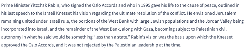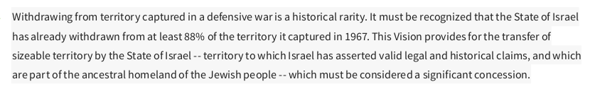 يجب اﻷخذ بعين الاعتبار بأن أسرائيل (وهو شيء نادر) قد انسحبت من أراض استولت عليها في حرب دفاعية (1967) رغم حقها التاريخي فيها