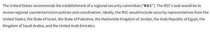 توصي الولايات المتحدة اﻷمريكية في #صفقة_القرن بإنشاء لجنة أمن إقليمي مكونة من الولايات المتحدة وإسرائيل فلسطين واﻷردن ومصر والسعودية واﻹمارات