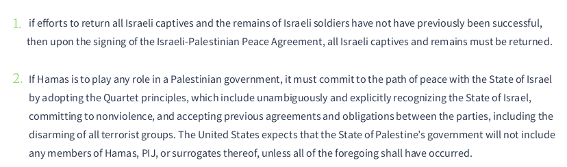 لا اتفاق سلام في #صفقة_القرن دون إعادة أسرى أو بقايا جنود إسرائيليين، وأعضاء حماس والجهاد مرفوضون تماما في أي أدور في الحكومة الفلسطينية