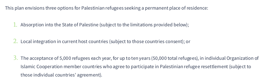مشكلة اللاجئين تنقسم إلى شقين: شق متعلق باللاجئين الفلسطينيين وآخر باللاجئين اليهود الذين أخرجوا من دول عربية كانوا يقيمون فيها يجب تعويضهم عن ذلك