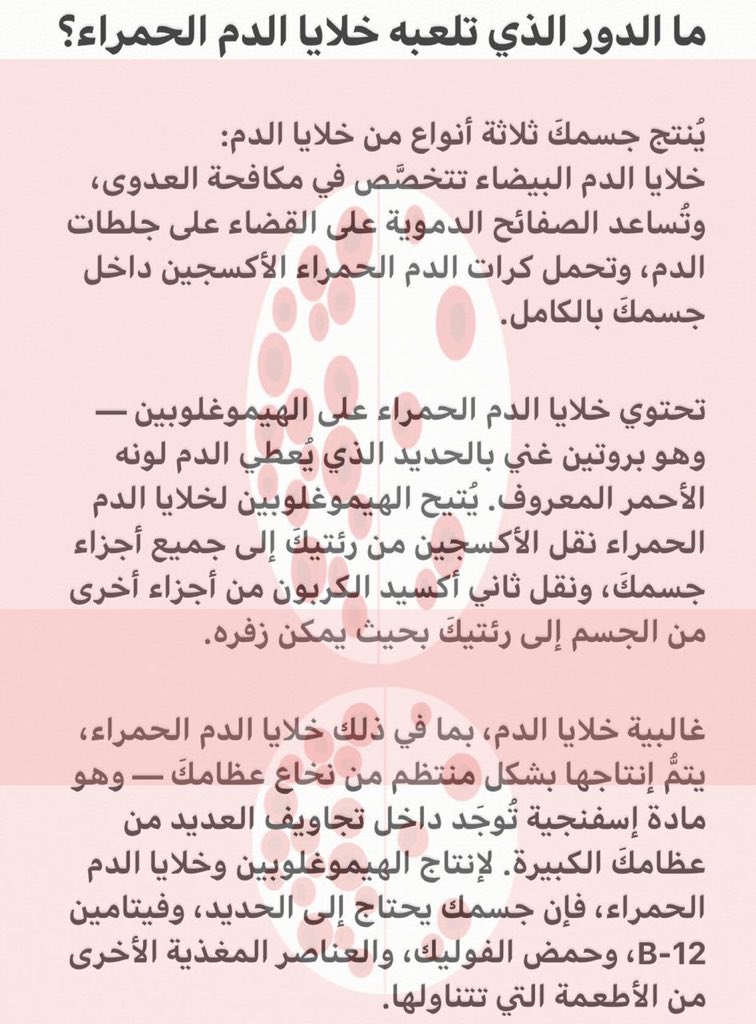 فمن دون وجود كمية كافية من الحديد، لا يستطيع جسمك أن ينتج ما يكفي من مادة خلايا الدم الحمراء التي تتمكن من نقل الأكسجين (الهيموجلوبين) و نتيجة لذلك قد يجعلك فقر الدم الناجم عن نقص الحديد تشعر بالتعب وضيق النفس