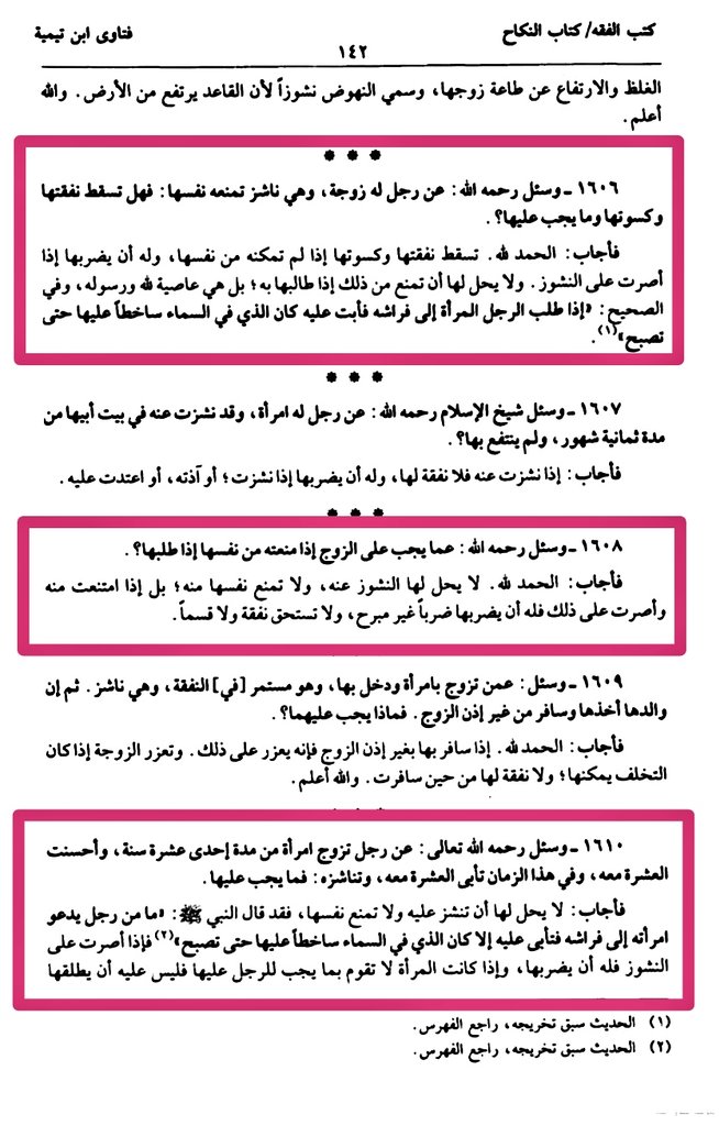 فأجاب : ( تسقط نفقتها وكسوتها إذا لم تمكنه من نفسها ، وله أن يضربها إذا أصرت على النشوز . ولا يحل لها أن تمتنع من ذلك إذا طالبها به ، بل هي عاصية لله ورسوله>>>
