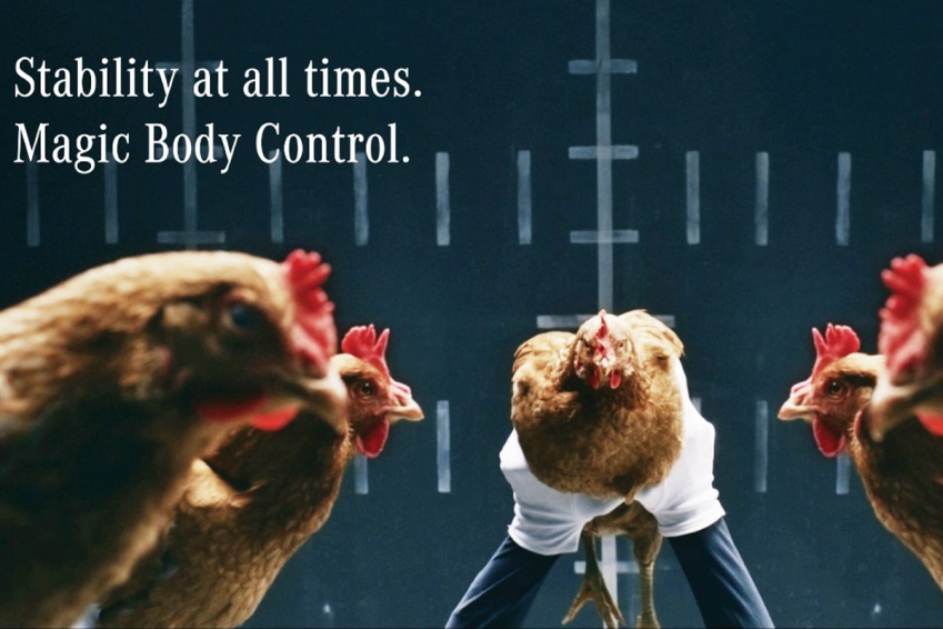 1- من الاعلانات الغريبة والمميزة في وقتها كان اعلان شركة مرسيدس الالمانية للسيارات الي اطلقته الشركة في سبتمبر عام 2013 وأستخدمت فيه دجاجة حتى تشرح خاصية ثبات سيارة بنز الجديدة