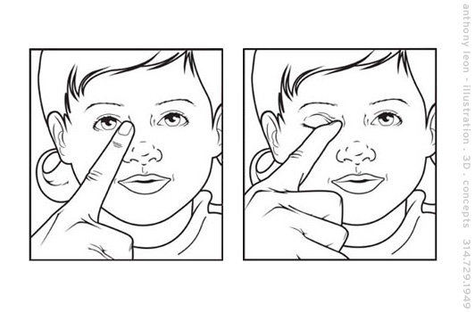 معظم حالات الانسداد لدى الأطفال تفتح تلقائيا بدون اي اجراء جراحي خلال السنة الأولي من العمر ولكن ذلك يسلتزم المداومة على التدليك بالاصبع على الكيس الدمعي باتجاه الاسفل (كما في الصورة أدناه)