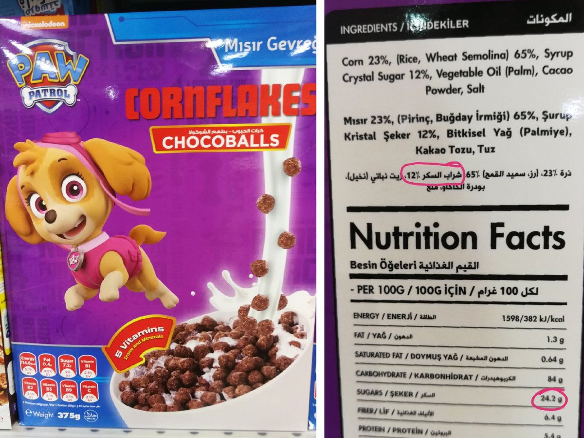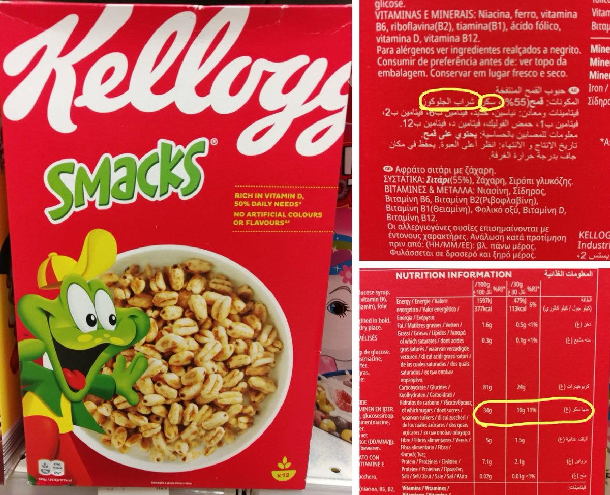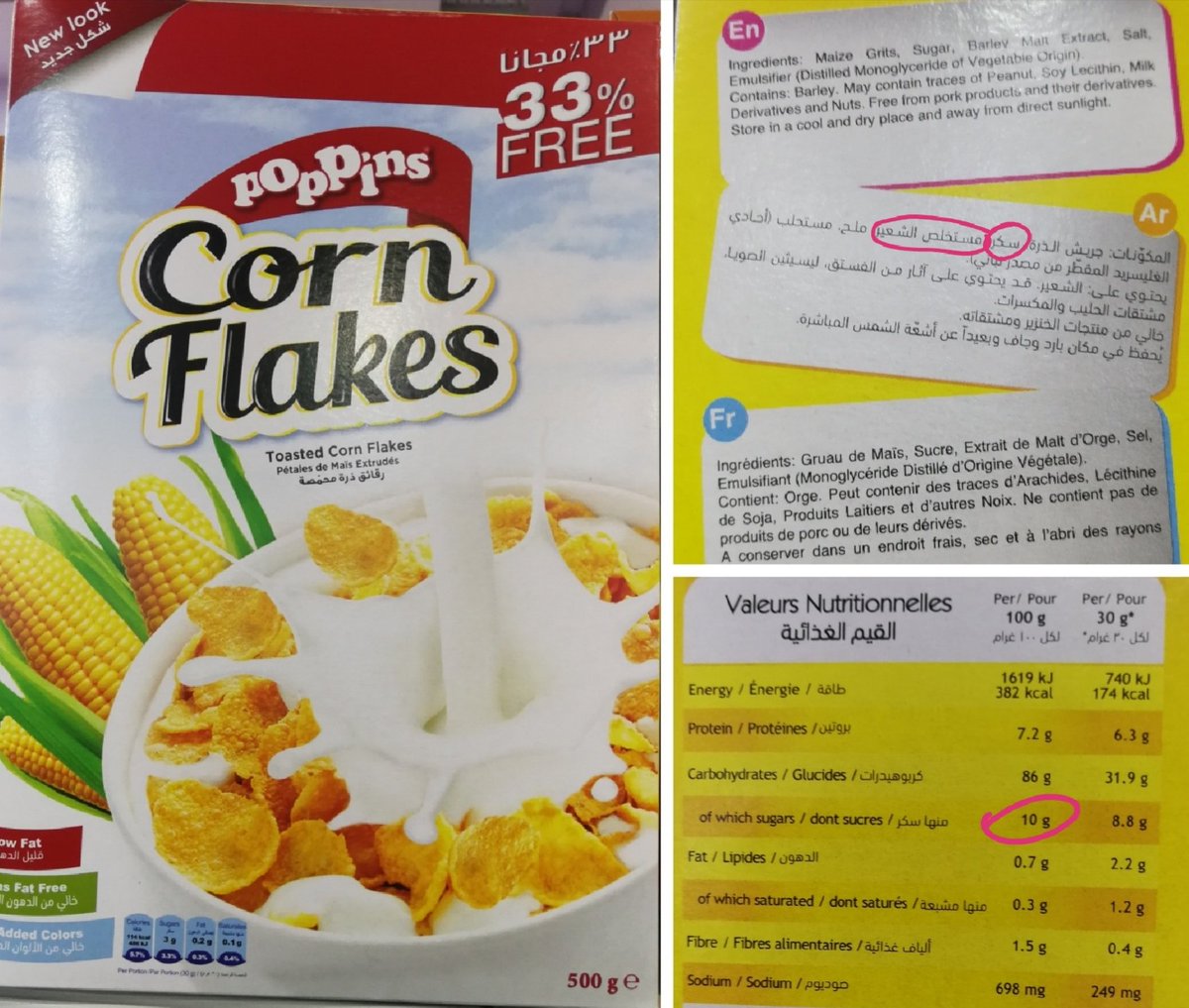 نسبة السكريات تعادل حوالي 15% من حجم العبوة (محسوبة عن طريق وجود أكثر من 4 جرام سكر في كل كوب كورن فليكس حجمه 30 جرام)
