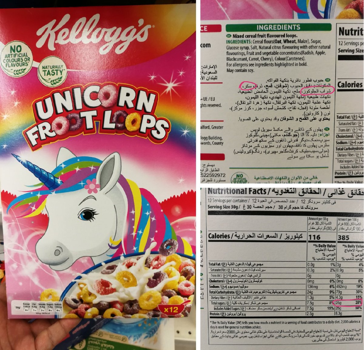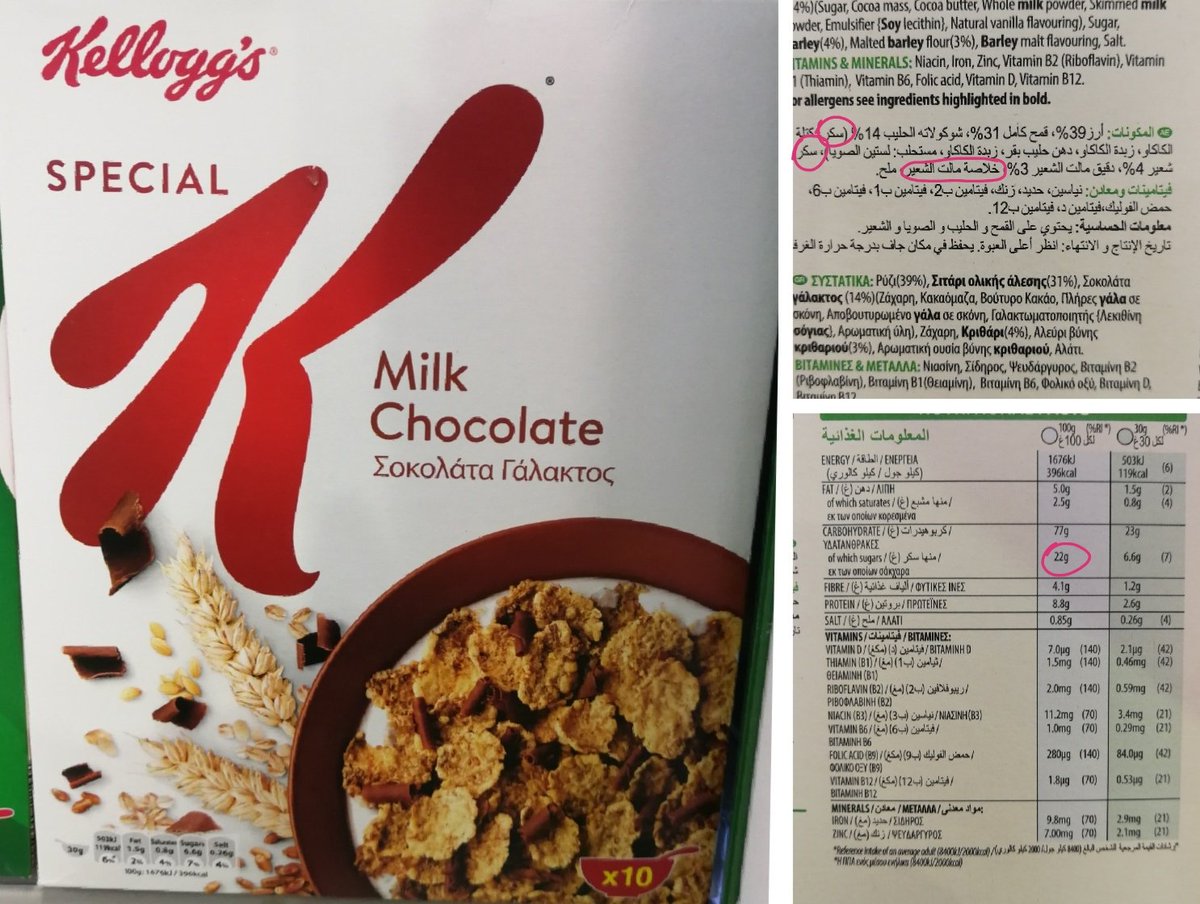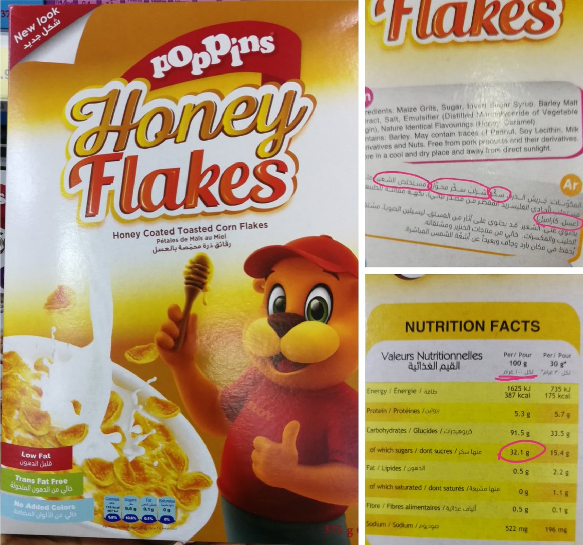 نسبة السكريات تعادل حوالي 15% من حجم العبوة (محسوبة عن طريق وجود أكثر من 4 جرام سكر في كل كوب كورن فليكس حجمه 30 جرام)