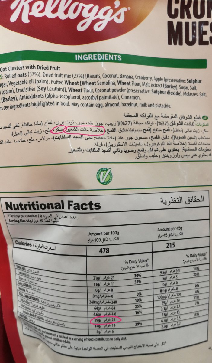 تشكل ما يتجاوز 23% من حجم المنتج (كل وجبة حجمها 30 جرام فيه 7 جرامات سكر).