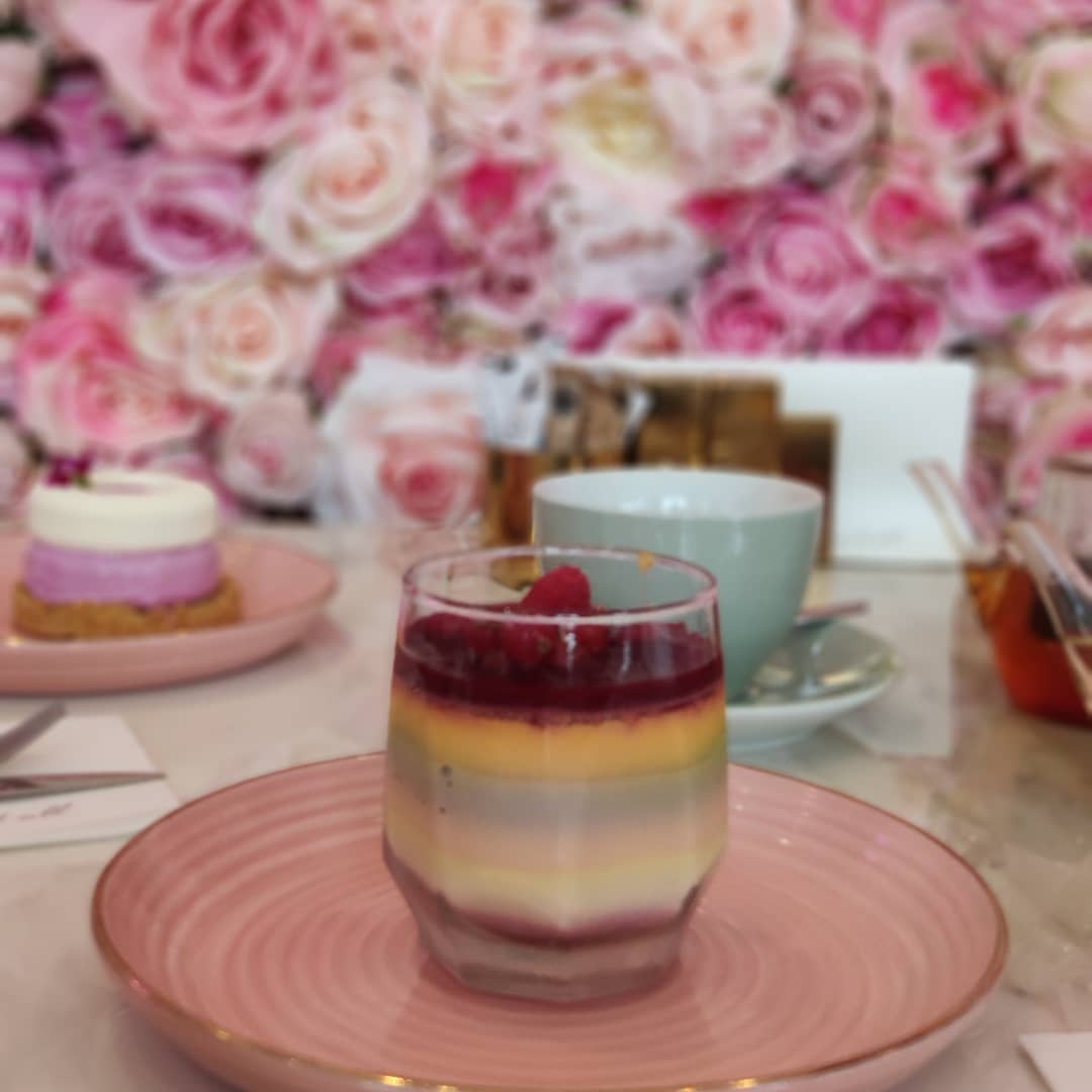 مقهي رائع من الزهور الاصطناعية على الجدران، مع كراسي الأرجوحة والحلويات باللون الوردي🌺