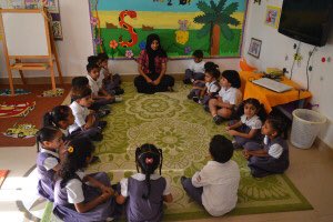 طيب بعد جلوس الأطفال حلقة تجلس المعلمة بنفس طريقة جلوس اطفالها وتبدأ اللقاء بتسمية اللقاء