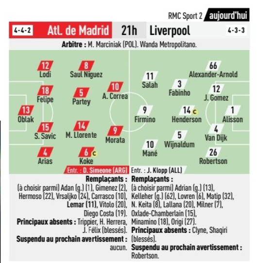 ليكيب | وهذا المساء ضد ليفربول، نادي العاصمة الإسبانية يجب أن يتدبر أمره بدون ثلاثة لاعبين من أساسيي العادة بداعي الإصابة: جواو فيليكس، هيكتور هيريرا وكيران تريبيير. إلا أن سيميوني أعلن عن خبر سار، عودة دييجو كوستا للمجموعة بعد أن كان غائباً منذ نوفمبر.