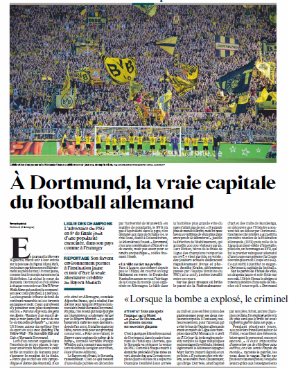 JDD | خلال حفلة نظمت في المجمع ذو 81 ألف مقعد، الرابر الأمريكي ماكليمور ارتدى قميص دورتموند لضمان دعم الحشد. "لأن النادي لطيف جدا ويمنح عواطف، إنه يحظى بشعبية في ألمانيا، يلاحظ ألجوشا باوس (مخرج وثائقي 'داخل بوروسيا دورتموند'). كما أنه الوحيد الذي يمنع البايرن من سحق كلي للدوري".