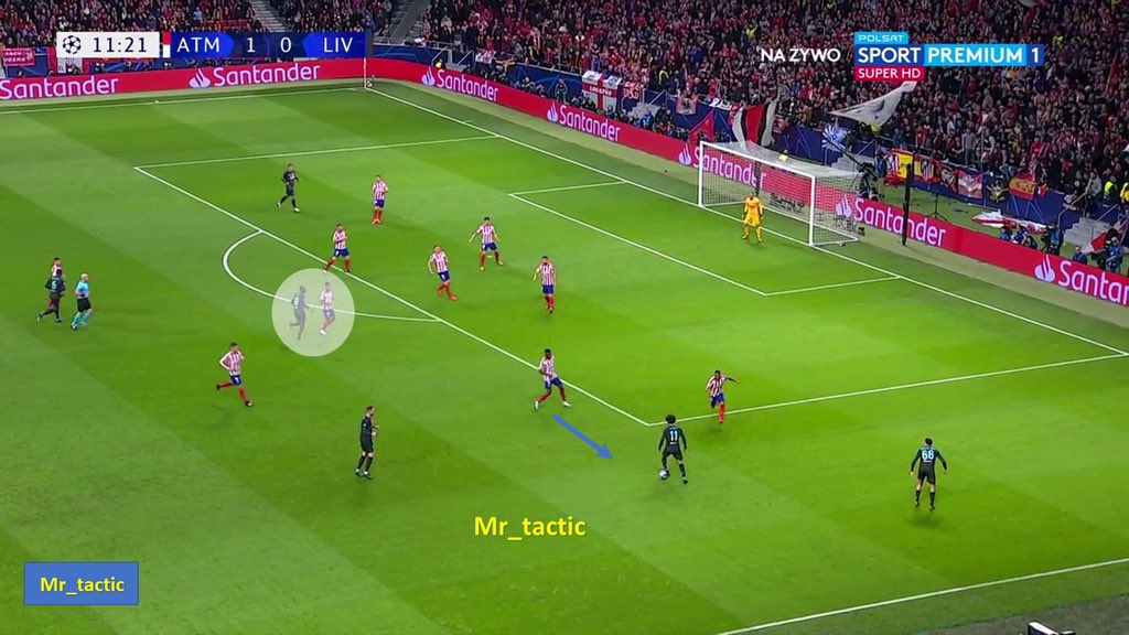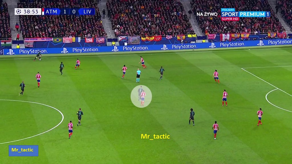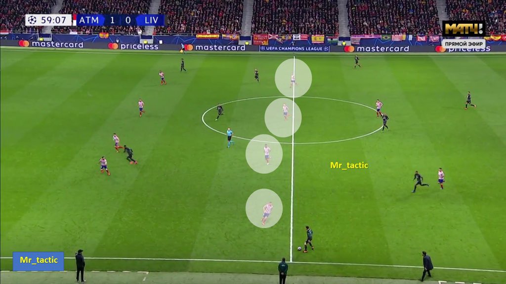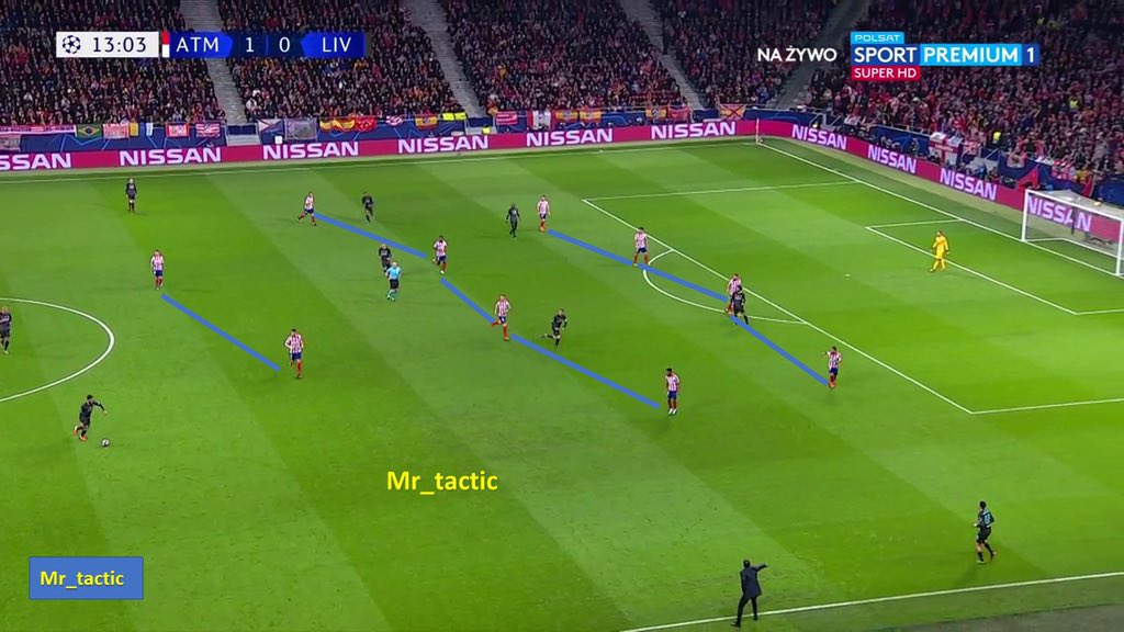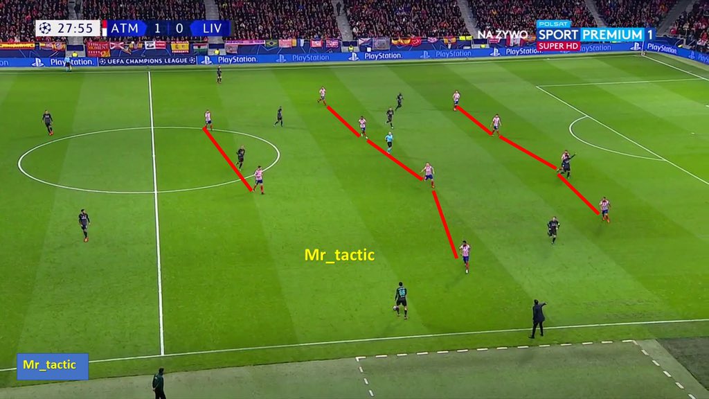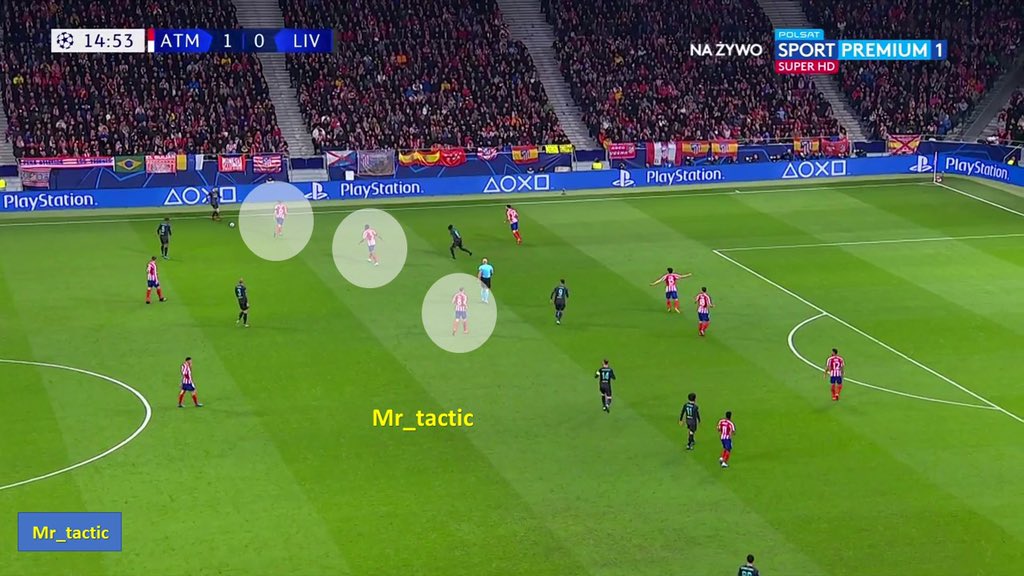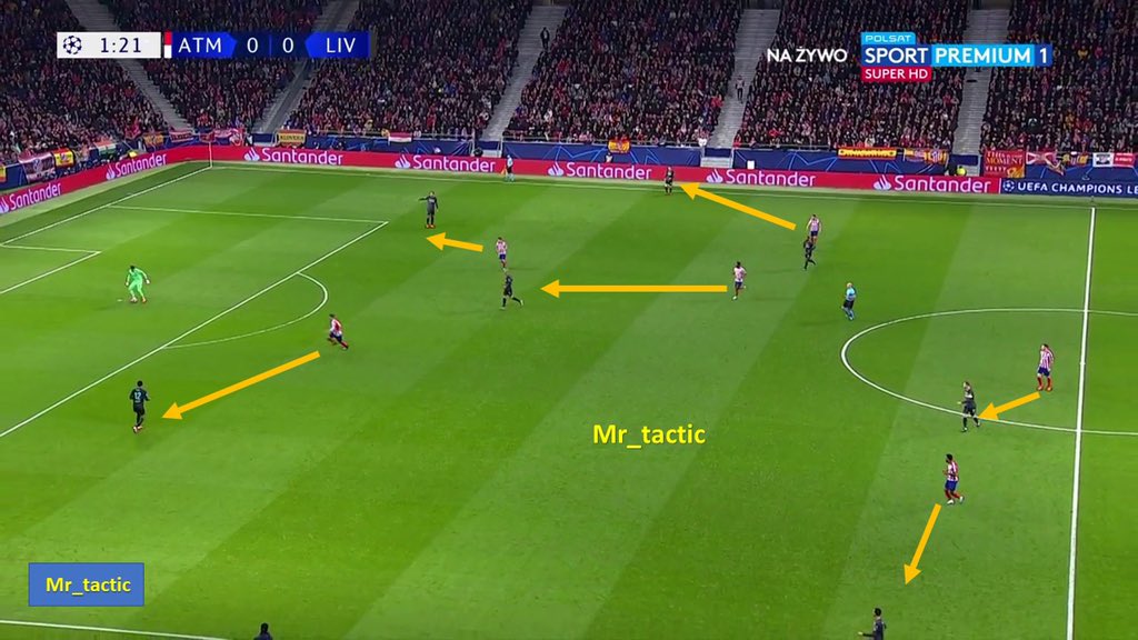 سيميوني منذ بداية المباراة بدأ بفكرة واضحة وهي الضغط العالي والبحث عن تسجيل هدف مفاجئ وإستغلال الدقائق الأولى من المباراة .. فهو كان يعلم جيداً بأن ليفربول ستكون لهم السيطرة على الكرة وبالتالي بحث عن إستغلال الدقائق الأولى