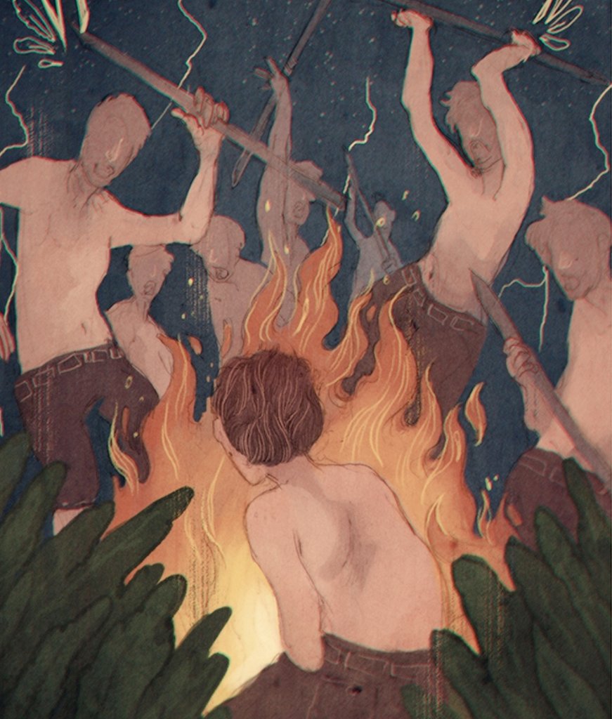 تمر أحداث الرواية ويستطيع جاك ان يصطاد خنزير ويشعر بالقوة والسلطة وهو يرى الدماء تسيل من الخنزير، كما تظهر هالة من التقديس لجاك بعدما اكل الأطفال من اللحم المشوي للخنزير.. و تظهر بوادر الانشقاق هنا لأن جاك يرى نفسه باصطياده الخنزير وإحضار اللحم انه الأولى بالقيادة من رالف،