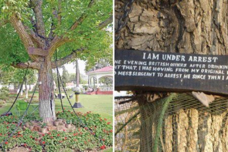 في منطقة “لاندي كوتال” التي تُعد معسكرًا للجيش في باكستان، يُوجد شجرة مقيّدة بالسلاسل من كل مكان كما لو أنها تمنعها من الهرب، إضافةً إلى لوحة معلّقة على أحد فروعها كُتب عليها: “أنا رهن الاعتقال”!