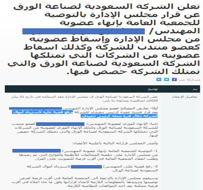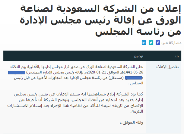 5. هذه التعثرات المالية لم تاتي من فراغ بل هي نتيجة تعثرات ادارية بدات تظهر على السطح، يمكن تلخيصها في مجموعة الإعلانات التي أعلنتها الشركة على موقع تداول كالتالي: